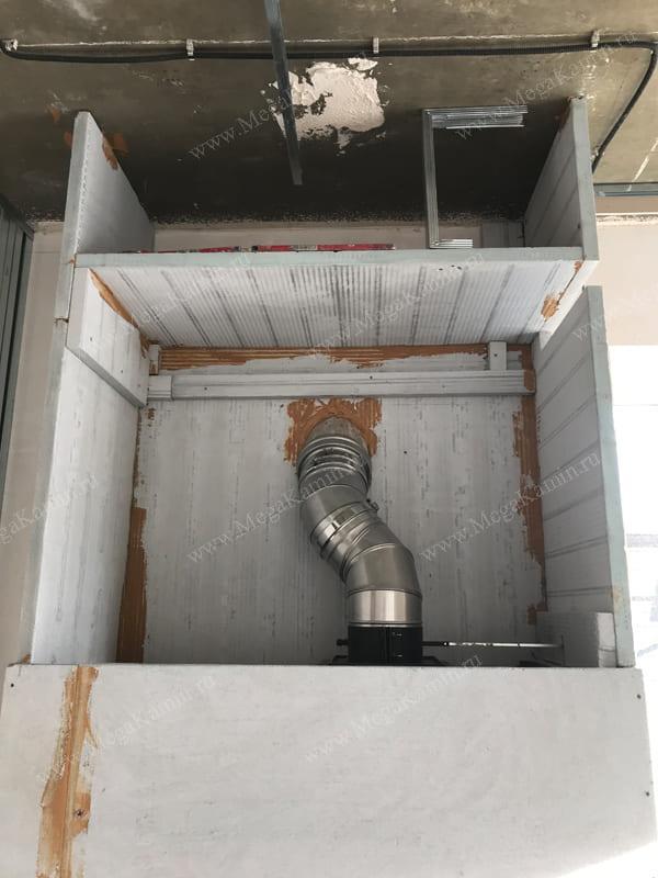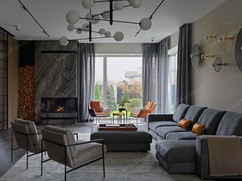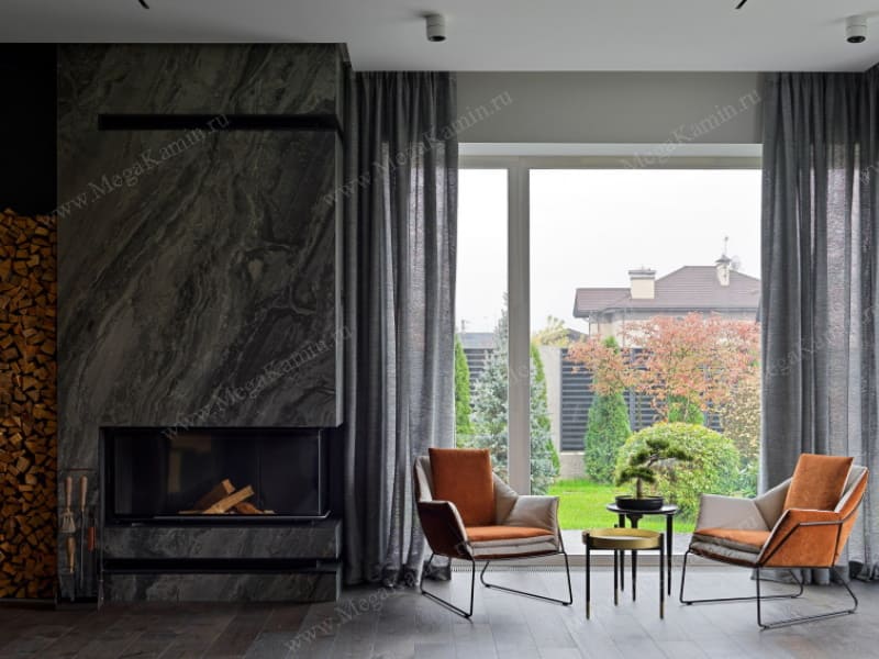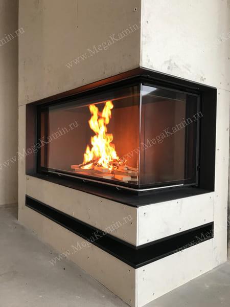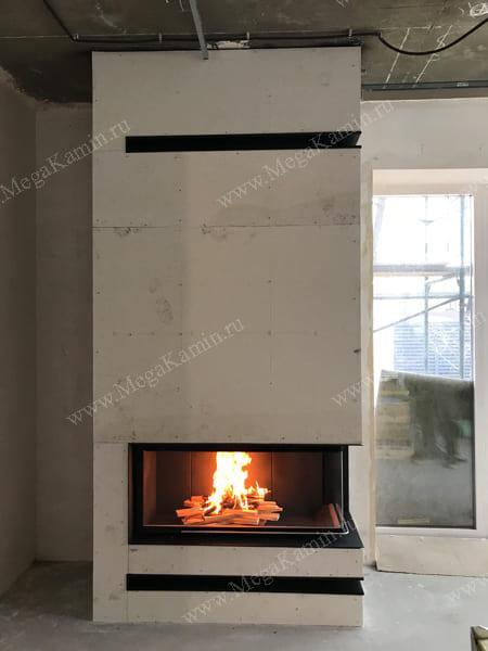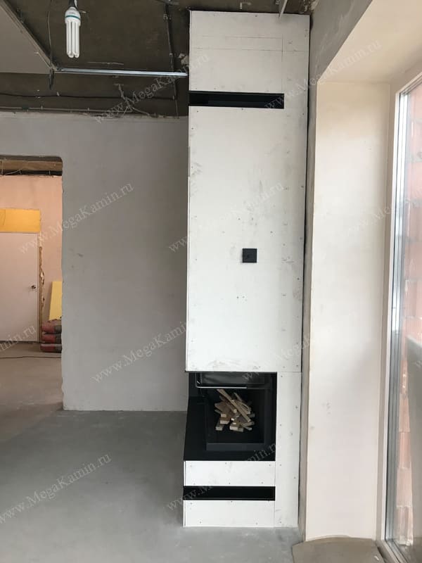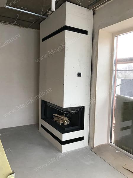 Современный пристенно-угловой камин с вертикальной нишей для дров. Проект камина с угловой каминной топкой "BRUNNER" (Германия). Габаритные размеры по дверце - ширина 1170/450 мм, высота 503 мм. Защитный короб камина выполнен из теплоизоляционных плит силиката кальция. Металлокаркас служит основой для отделки камина крупноформатной керамической плиткой. Стиль камина дополняют угловые туннельные решетки для конвекции воздуха, изготовленные под заказ по размерам каминной топки. Купить камин от проекта до монтажа в интернет-магазине "Мега Камин".